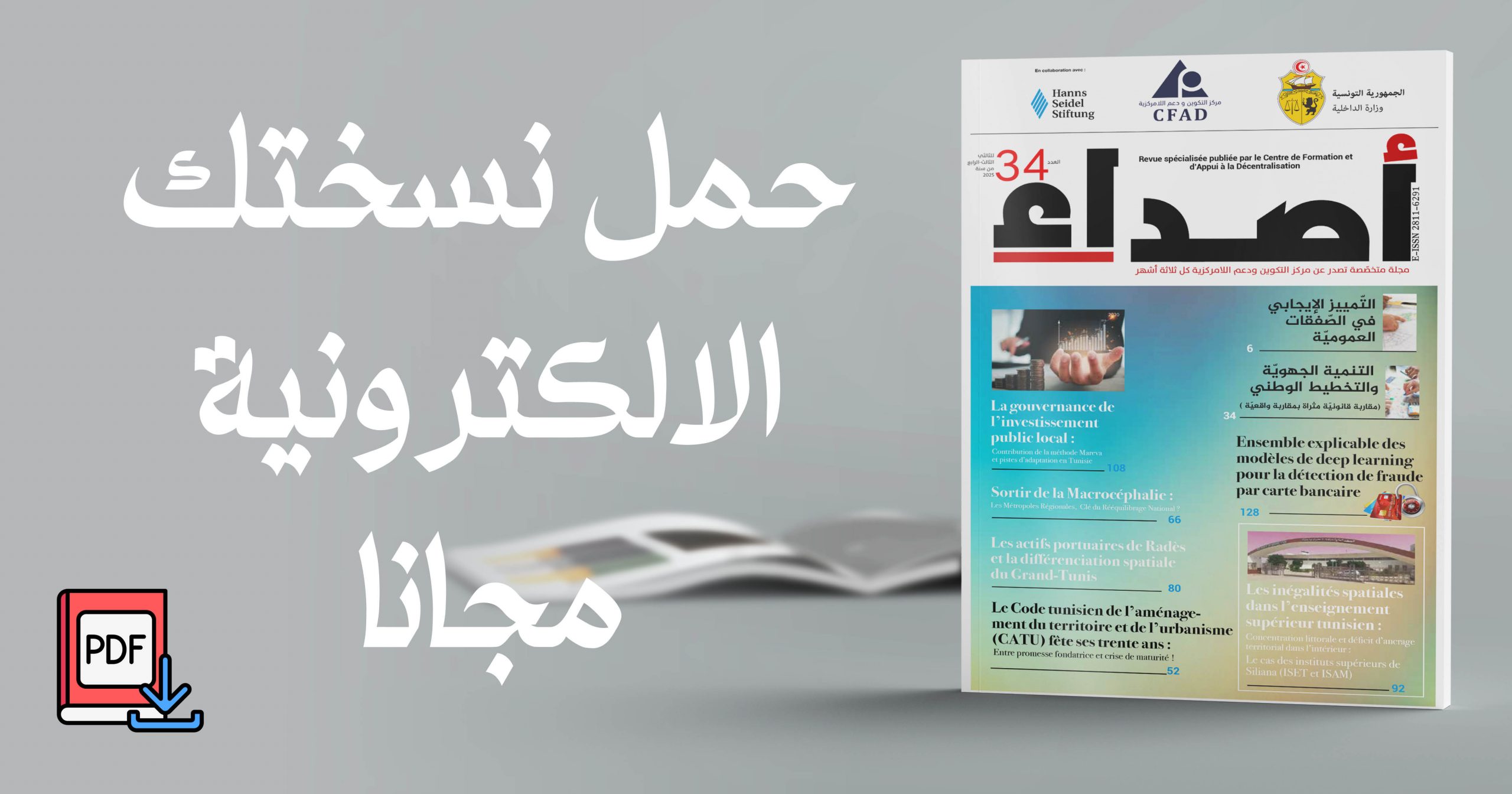 اختارت مجلة” أصداء ”  الصادرة عن مركز التكوين ودعم اللامركزية بوزارة الداخلية ، توديع السنة الحالية  عبر إصدار  عدد  استثنائي متميز ومتنوع  يعكس في الواقع مدى انشغال الباحثين بتونس بقضايا أساسية تتصل بالتنمية والتخطيط الترابي و التحديات التي تفرضها آليات الرقمنة والابتكار التكنولوجي لإرساء حوكمة رشيدة ومستدامة في التسيير والهيكلة المجالية، ويضم هذا العدد ثماني مقالات  تعكس تنوع الحقول المعرفية التي تتوزع بين قضايا القانون الاقتصادي والتنمية الجهوية  ومنها التعريف بالإطار القانوني المنظم للتدخل العمومي ودوره في تحقيق العدالة المجالية وتقليص الفوارق بين الجهات كما يتناول   هذا العدد مسائل  تتعلق بالحوكمة المحلية والاستثمار العمومي بما يعزز عناصر الشفافية وحسن التصرف في الموارد العمومية ويدعم مسارات التنمية المحلية على المستويات الاقتصادية والاجتماعية والثقافية والبيئية، وعموما فإن مجمل المقالات التي تم انتقاؤها لتعكس مدى حرص المجلة على مواكبة التحولات التي يشهدها المستوى الترابي والمؤسساتي نظرًا لتعدد مجالات تدخل الفاعل الترابي على المستوى المحلي وهو ما يرتبط أساسًا بتنامي حاجيات الأفراد وتطور انتظاراتهم.